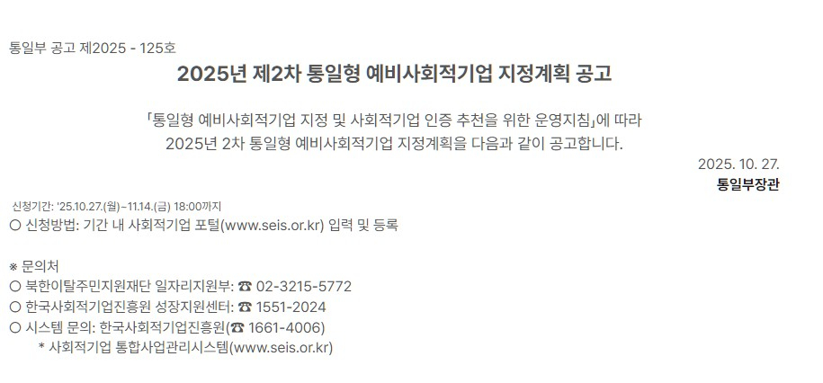 (~ 11.14)[통일부] 2025년 2차 통일형 예비사회적기업 지정계획 공고