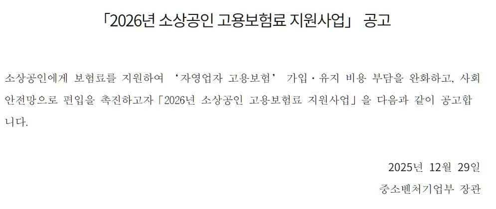 2026년 소상공인 고용보험료 지원사업 공고