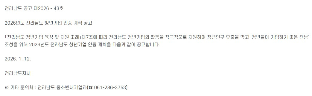 [~12.24.(목)]2026년 전라남도 청년기업 인증 계획 공고