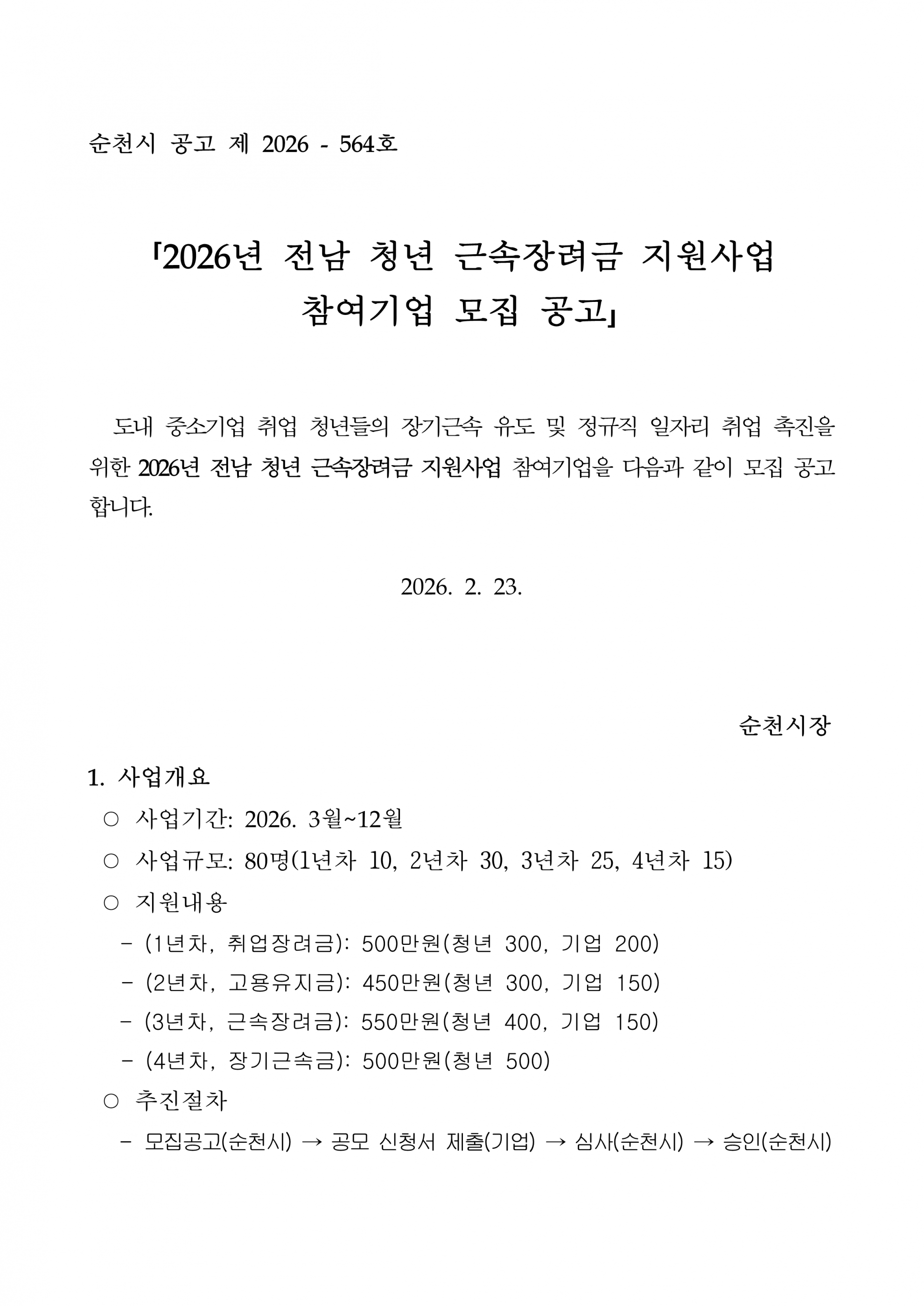 [~03.09.(월)] 2026년 전남 청년 근속장려금 지원사업 참여기업 모집 공고