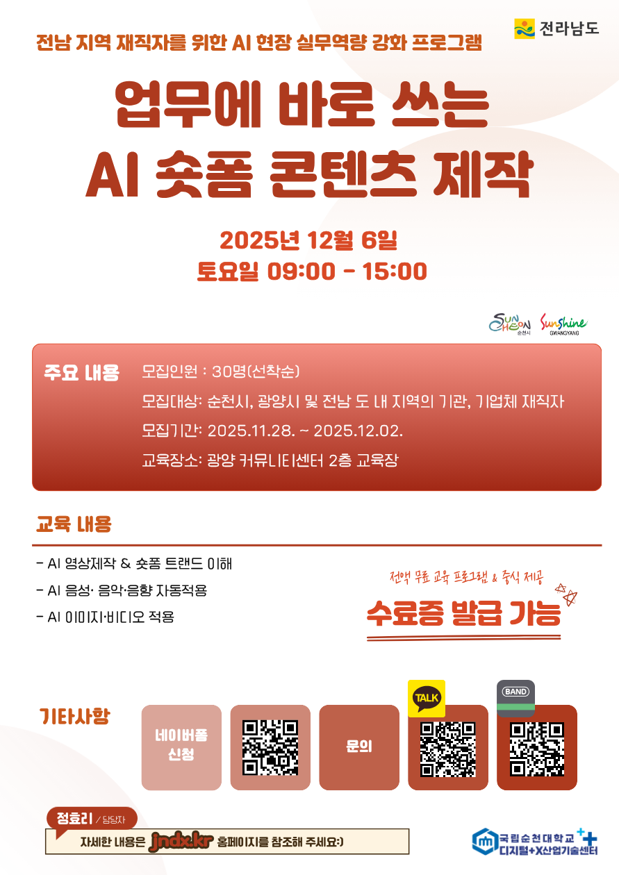 4. 모집대상: 순천시, 광양시 및 전남 도내 기관, 기업체 재직자