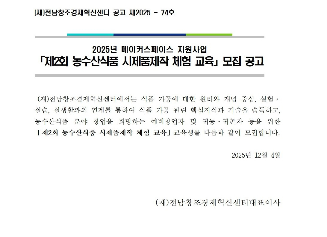 [~12. 16.(화)]2025년 메이커스페이스 지원사업「농수산식품 시제품 체험교육」 모집 공고