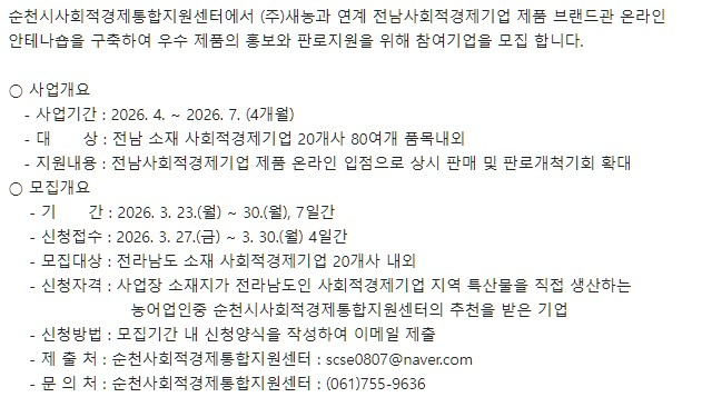 [~03.23.(월)]2026년 상반기 전남 사회적경제기업 온라인 쇼핑몰 판로개척 지원입점업체 모집공고
