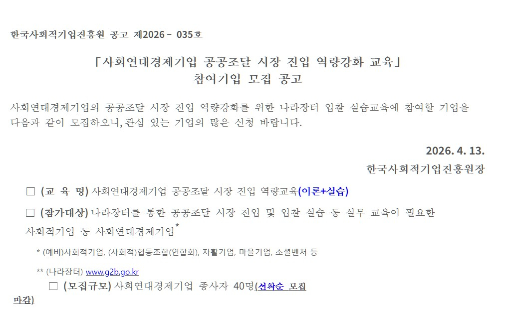 [~04.27.(월)] 「사회연대경제기업 공공조달 시장 진입 역량강화 교육」 참여기업 모집 공고