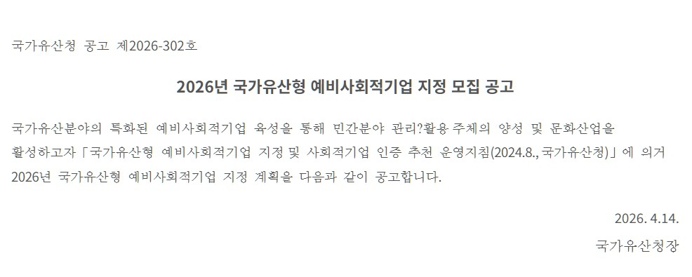 [~05.06.(수)] 2026년 국가유산형 예비사회적기업 지정 모집 공고