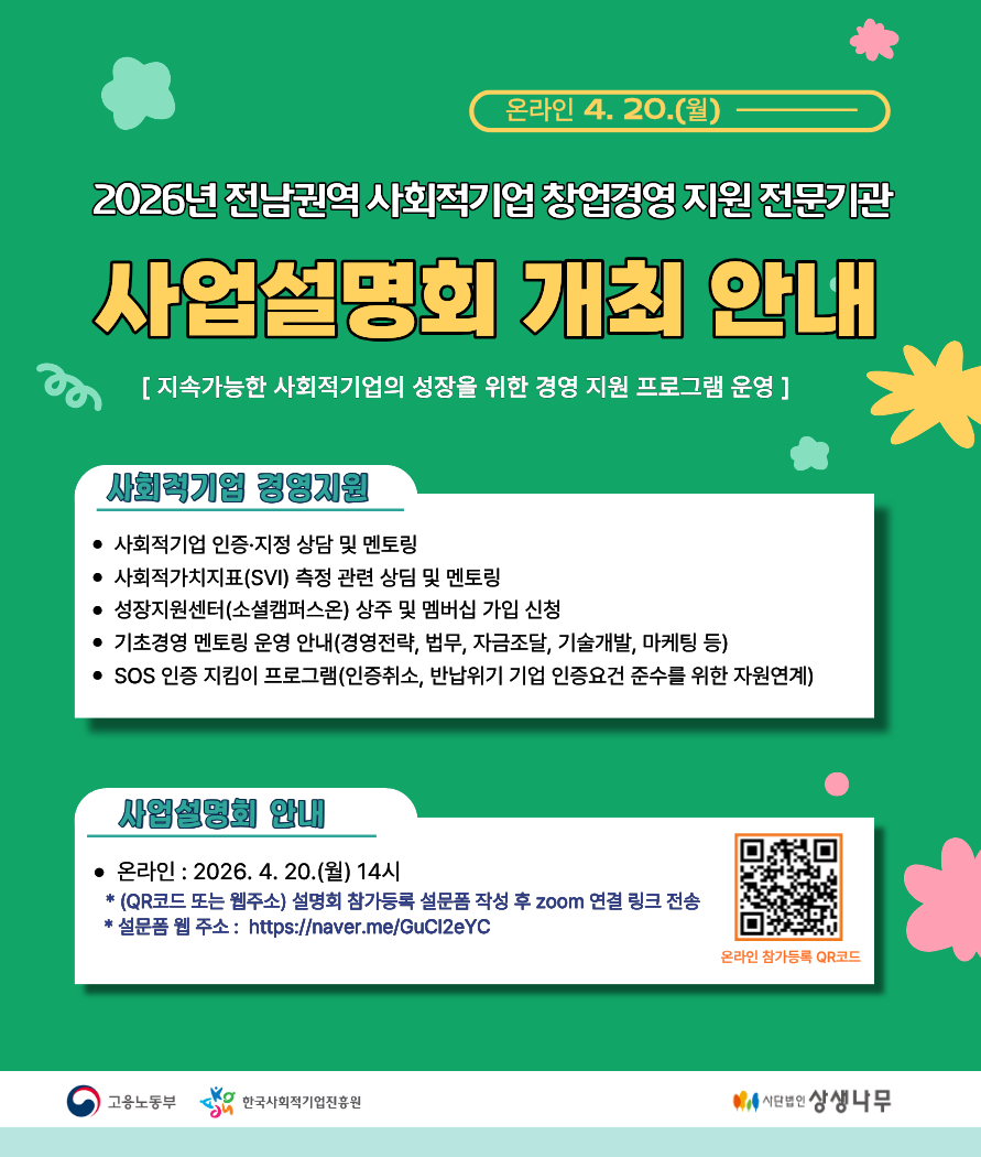 [04.20.(월) 14:00~] 2026년 전남권역 사회적기업 창업경영 지원 전문기관 사업설명회 개최 안내